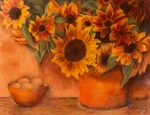 1998Zonnebloemen en ei, 50x65, ingelijst in gele lijst, achter glas
